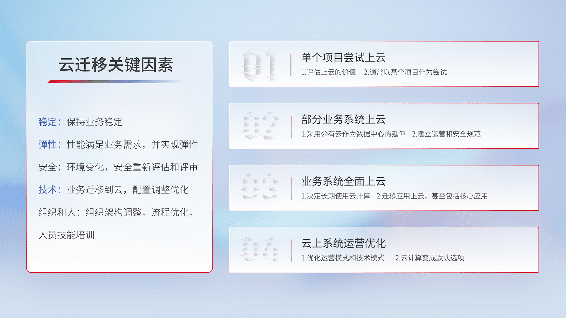 结合实际业务,,,从规划设计、、、、云平台选型、、、云原生改造、、、、数据迁移、、、、集成交付,,,,迁移全过程为客户识别最佳上云路径,,,,做好风险识别管理,,,,设计网络架构、、、身份权限、、安全审计合规、、、、操作审计、、日志审计、、、、监控告警策略、、、多站点容灾设计等,,对云上基础设施进行整体规划,,,,提升IT治理水平,,,以满足弹性、、、、高可用、、高性能的需求。。。