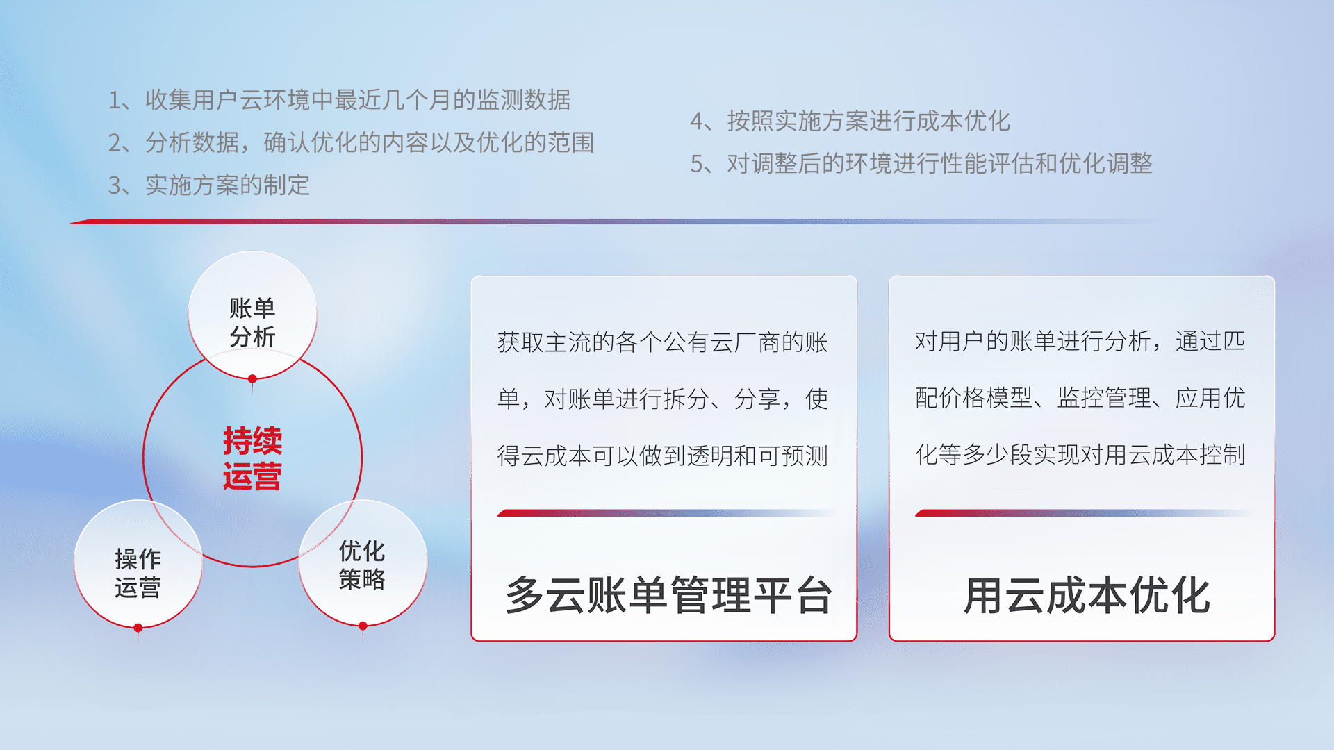 通过多云纳管,,,以统一的资源数据模型把客户的云资源进行抽象和封装,,,,进而实现对多云资源的统一操作,,,,保障云资源管理的可靠性、、稳定性与可用性。。。。量身定制化运维内容,,,配置、、开发运维、、、、补丁管理、、备份、、、监控、、认证和访问管理、、、审计和日常巡检等,,,保障在用云过程中的可靠度,,,稳定度以及高可用率。。。。